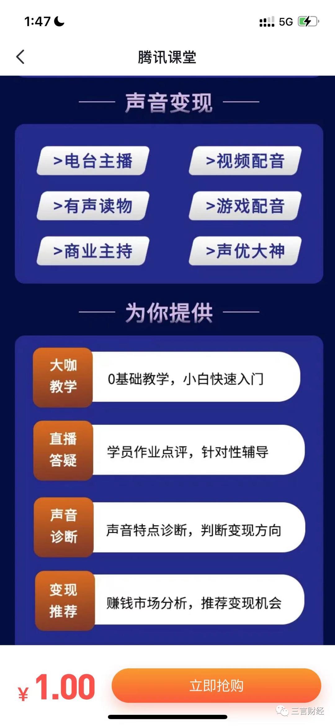 点击报名链接,这个课程详情就比爱奇艺那个简陋了不少。不过这个课程更强调“变现”,在最明显的位置写着“声音变现从这里开始”。