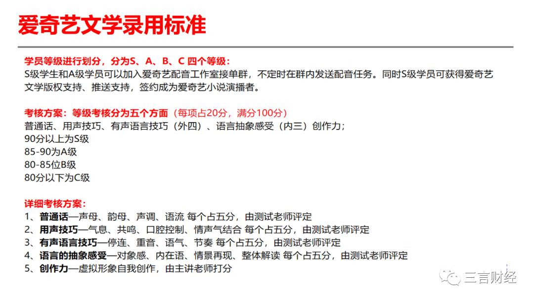学习3个月后,学员会根据一定的考核标准进行分级,最高的S级会签约成为爱奇艺小说演播者。至于收入,该老师称提成能高达30%,也就是小说销售10万,能收入3万。