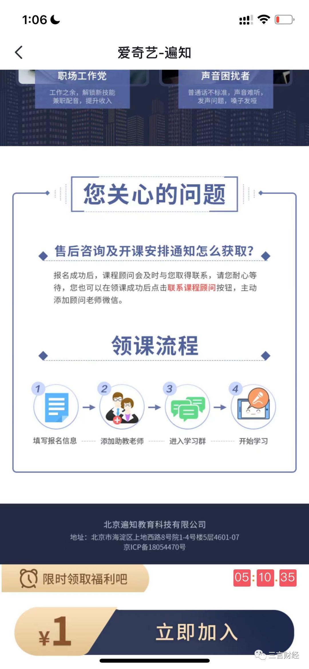 页面的最底部写着,该配音课程的运营主体是北京遍知教育科技有限公司(以下简称遍知科技)。三言财经支付成功后,收款方也是这家公司。