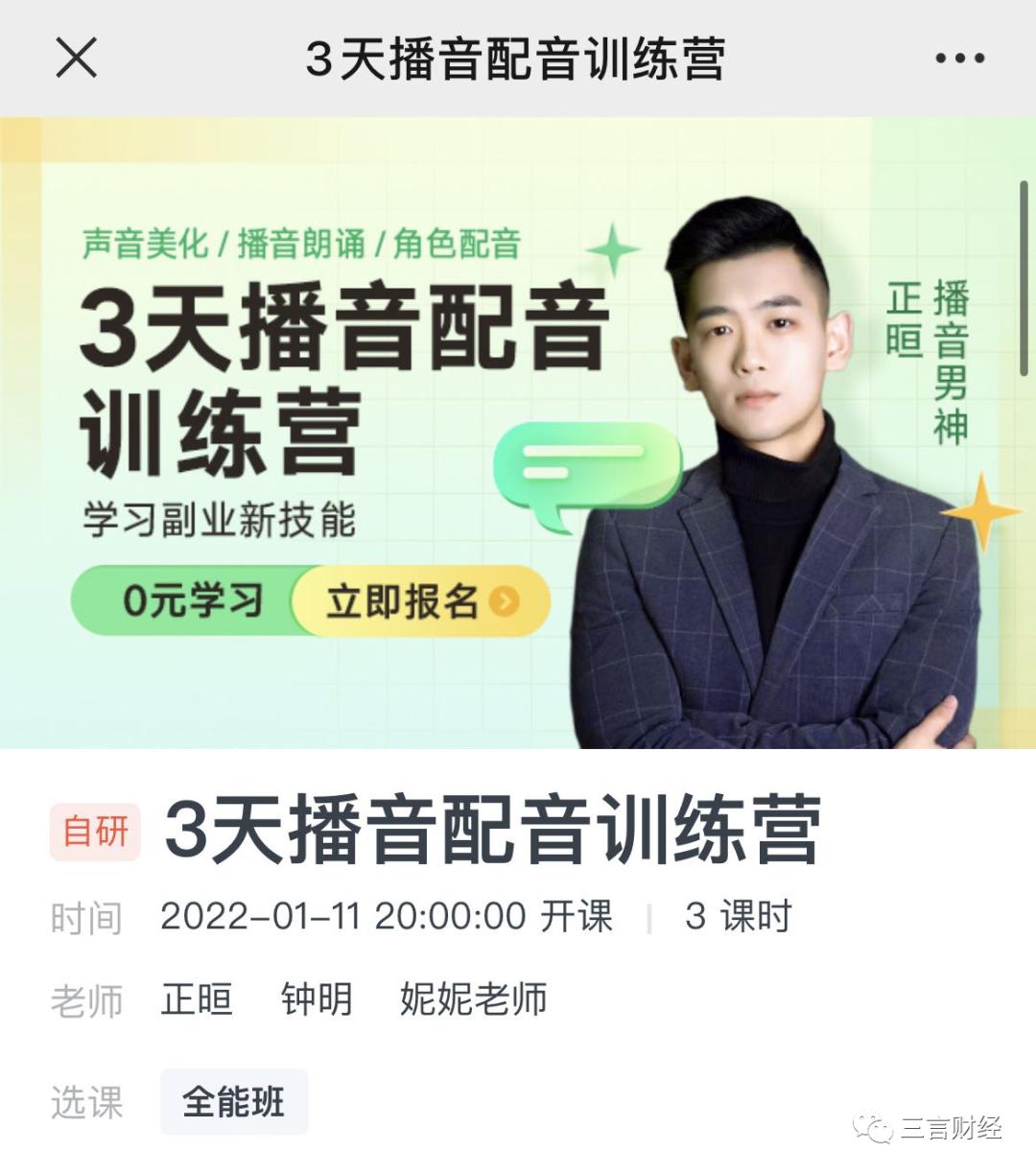 同样是短时间+低学费的套路,网易云课堂的课程为“3天播音配音训练营”,可以免费报名。