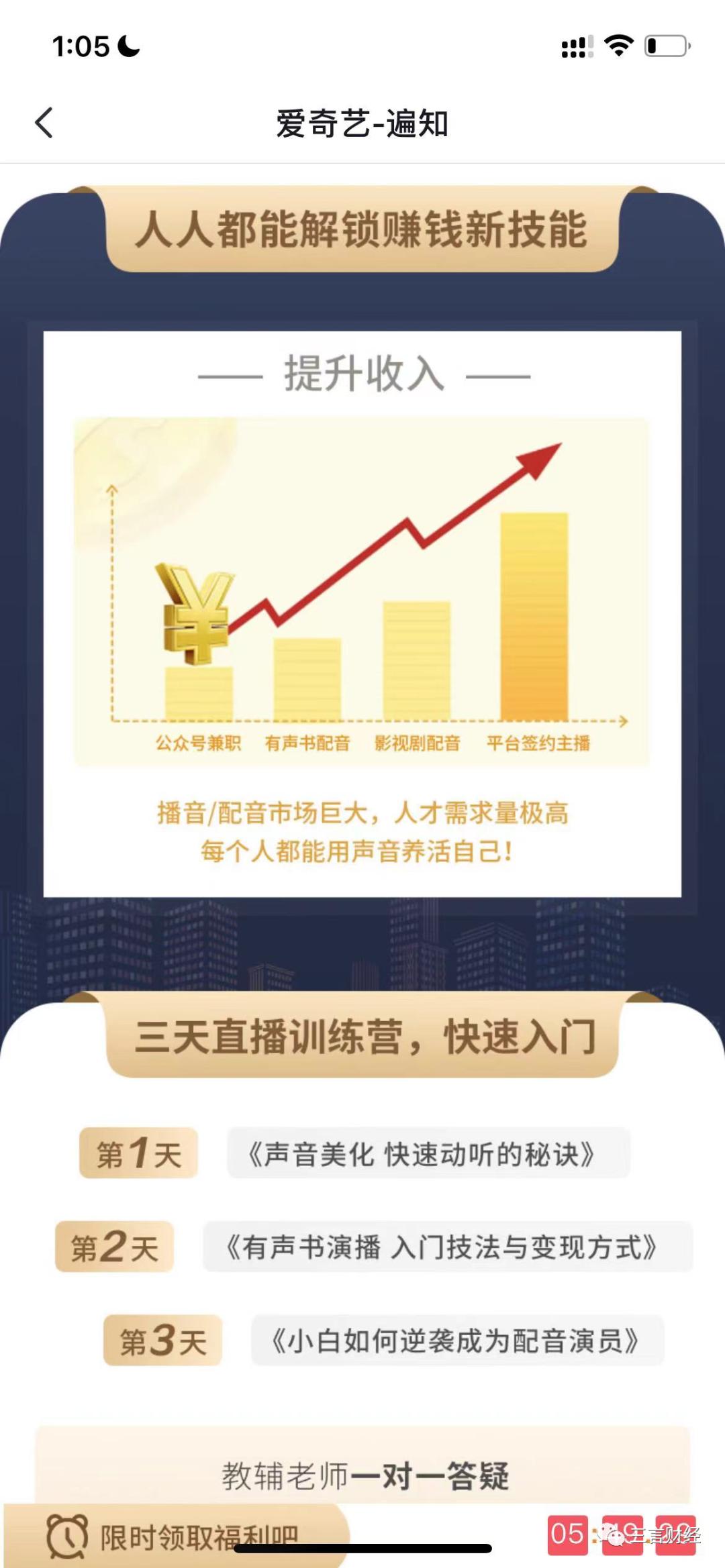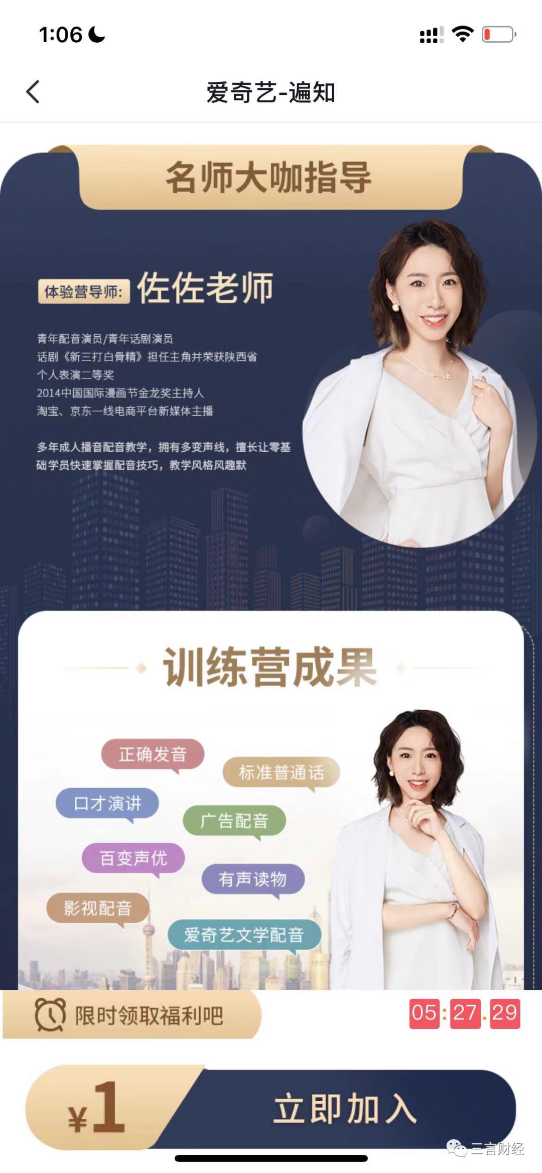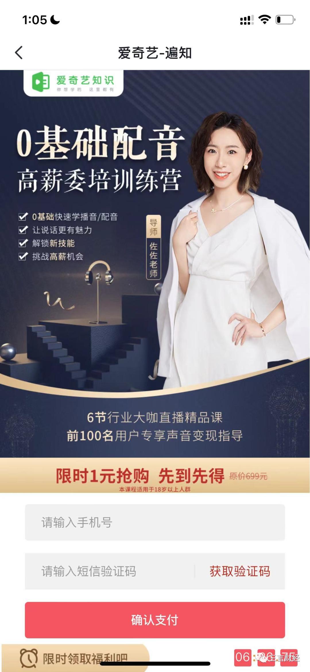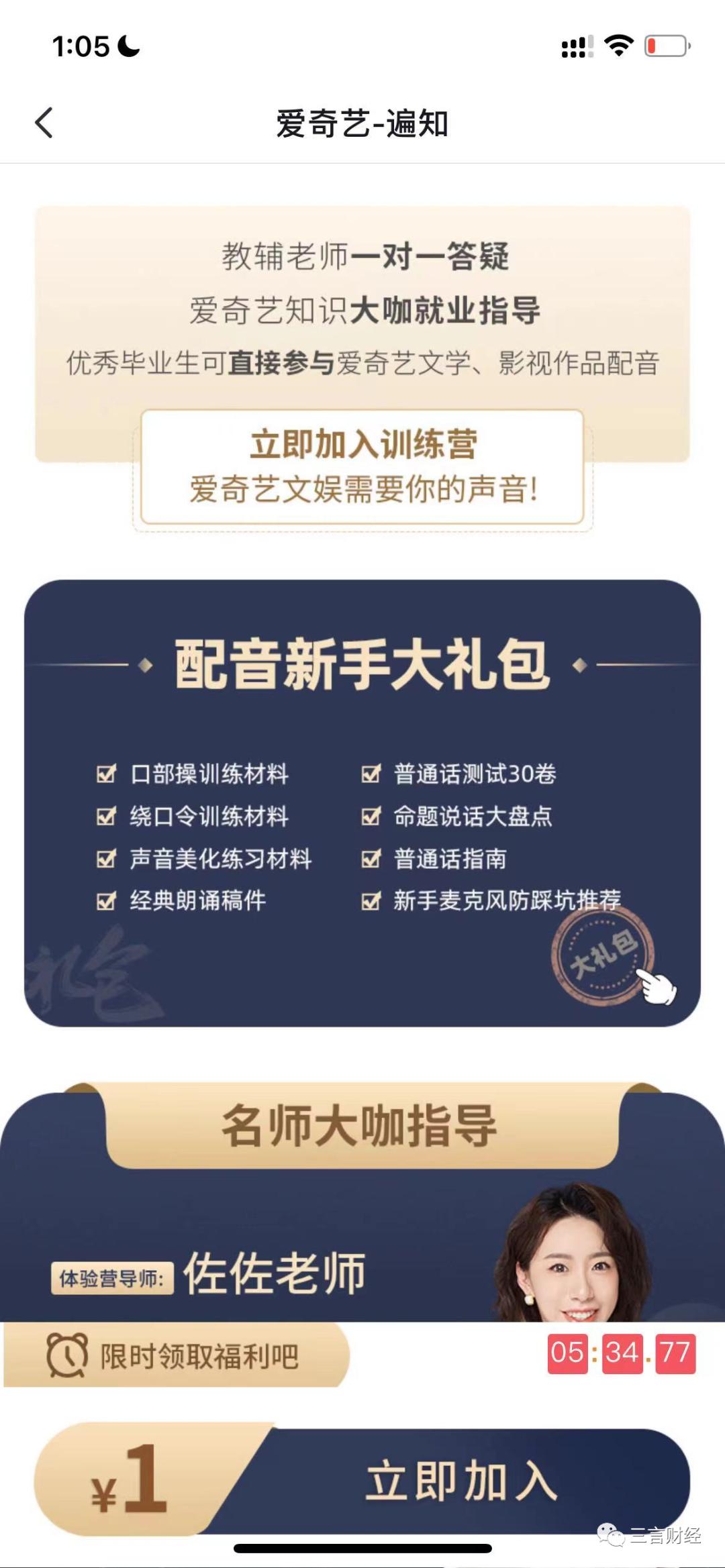之后,他开始介绍配音的前景,总之一句话就是前景广、门槛低。“来爱奇艺知识,0基础配音训练营,只需一元,就有六节精品课”,而且优秀学员有机会直接签约为爱奇艺文学小说演播者,作品将给与推广和扶持。