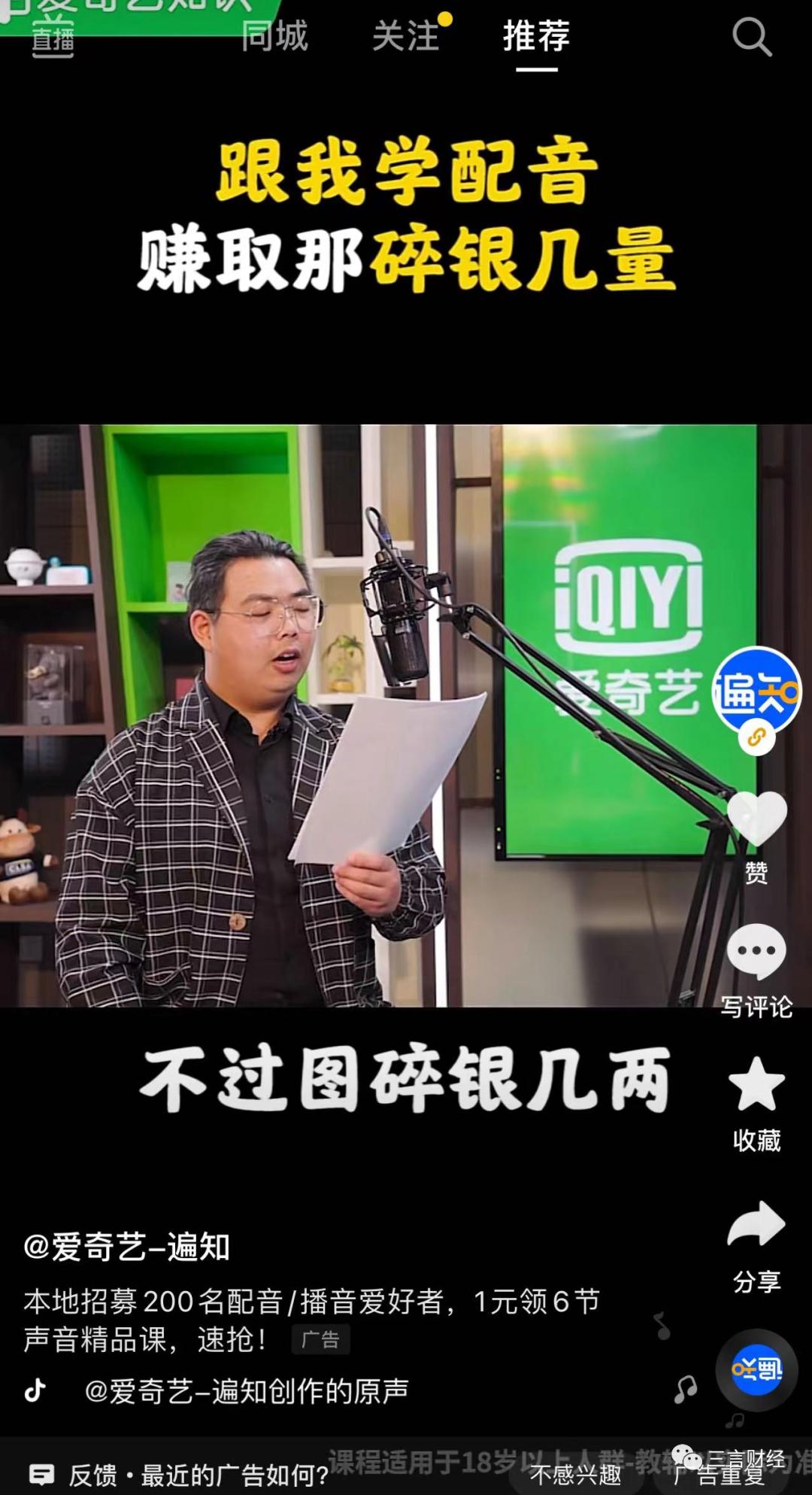 在三言财经看来,爱奇艺配音课程和此前的配音广告并无太大的差别。虽然有平台的背书,但宣传的简单易学、轻松赚外快实际只是空中楼阁。