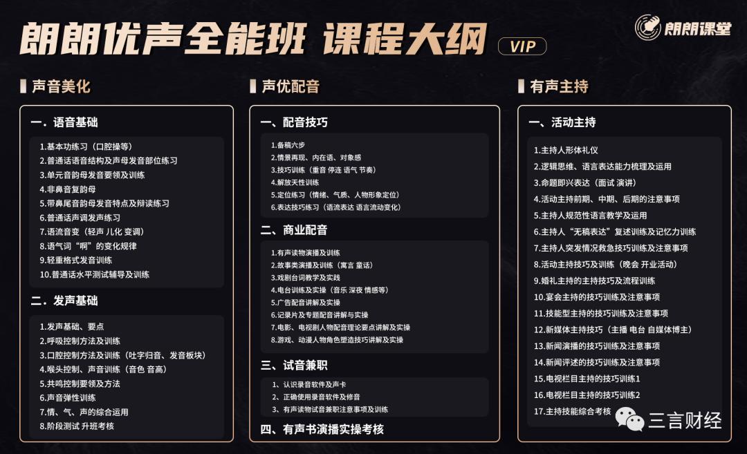 两个课程的区别就是全能班比配音班学习的东西更多,参考下图的课程大纲,全能班多学习了“有声主持”这个部分。