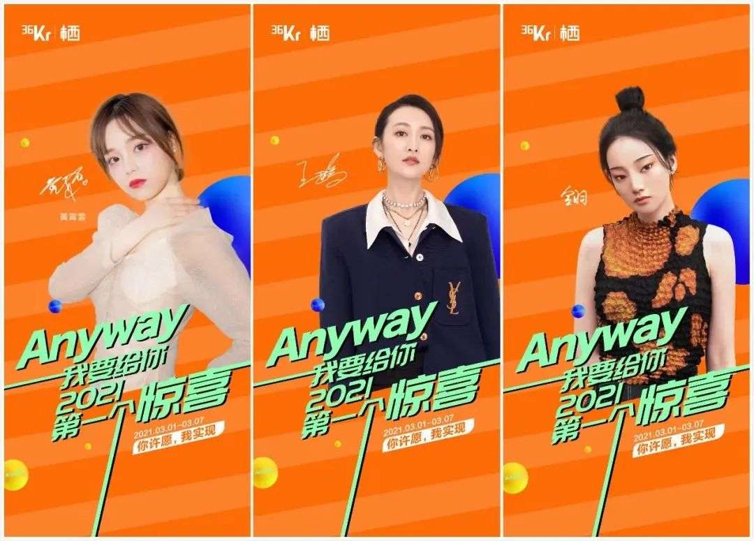 3月1日至7日,Anyway「我要给你2021年的第一个惊喜」再次开放线上许愿通道,联合了11家跨界品牌及项目合作伙伴,并邀请到王鸥、黄霄雲以及虚拟偶像翎担任「首席心愿官」。