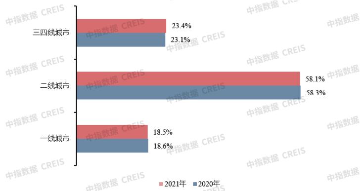 中指研究院企业事业部研究负责人刘水表示,“50家百亿代表企业的二线城市业绩贡献占比为58.1%,较2020年降低了0.2个百分点;三四线城市需求得到小幅释放,2021年业绩贡献率为23.4%,同比增长0.3个百分点;一线城市业绩贡献率为18.5%,总体保持稳定。”