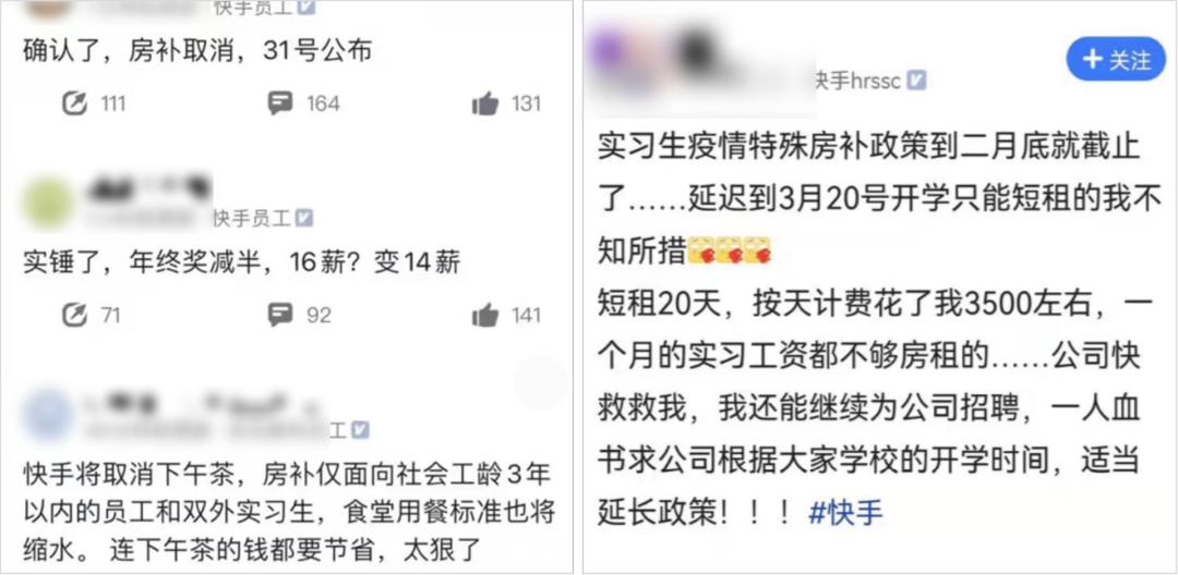 快手更是表示从 2022 年 2 月起,取消下午茶和免费三餐。每月数千元的全员房补福利,改为仅向社会工龄 3 年以内的员工发放。