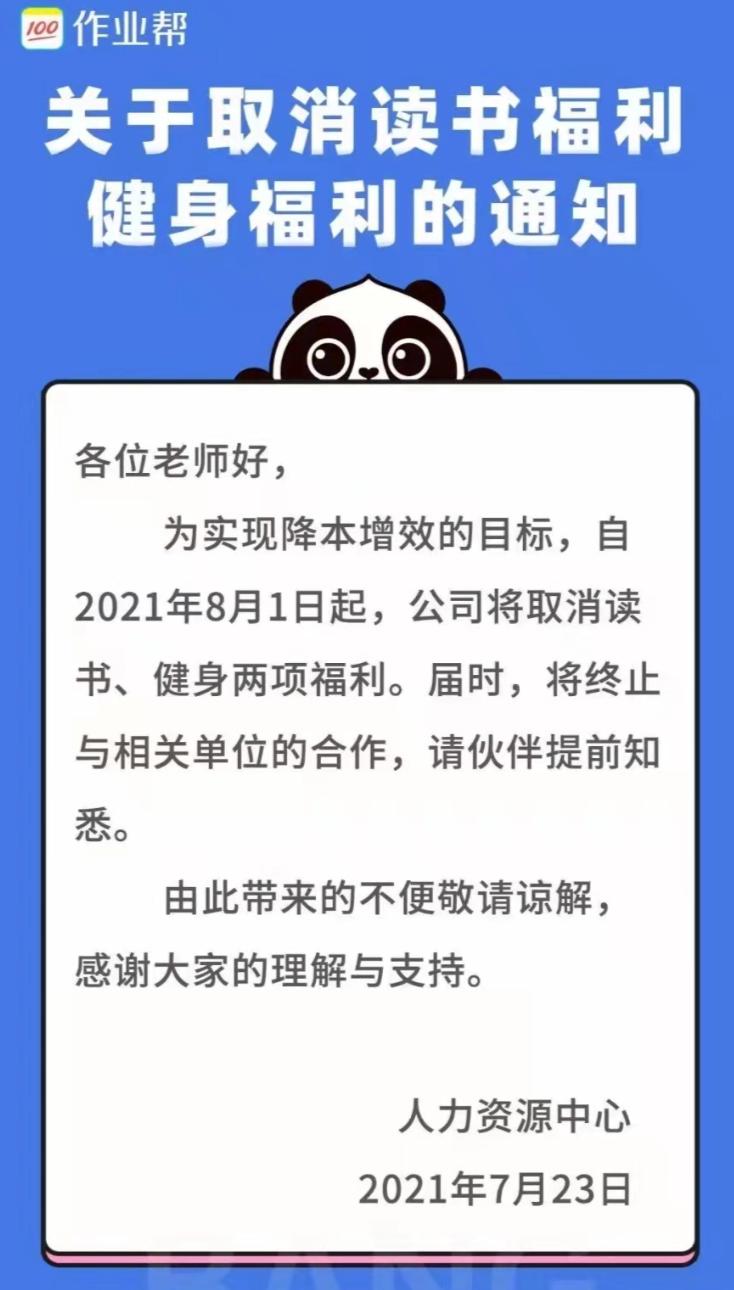 “福利缩水”最开始出现在教培行业里。7 月 23 日,认证为“作业帮员工”的用户在脉脉上曝出,公司“人力资源中心”发出《关于取消读书福利健身福利的通知》。