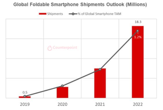 各方机构统计的数据增长最为直观,2018年至2020年,全球折叠屏手机出货量从19.8万台增长至280万台,2021年有望达750万台。另据Counterpoint Research预计,2022年底,这一数字将达到1830万台。