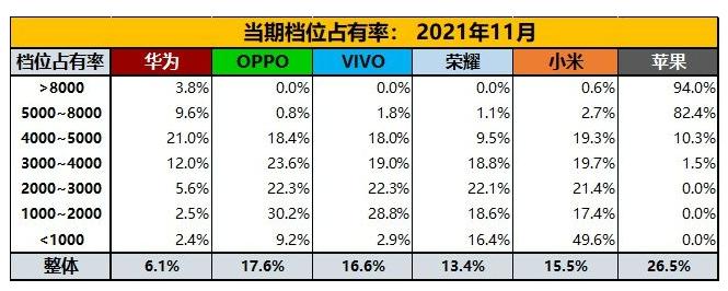 根据网友@安乎都护府长史 提供的市场零售数据,2021年11月,国内手机市场高端档位的品牌集中度同比再次提升,5000元~8000元档位、8000元以上档位集中度分别为98.5%、97%,其中苹果占据绝对优势。