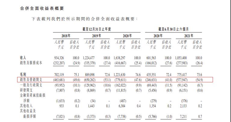 之所以会出现这样的情况,主要就是因为营销费用的高企。招股书显示,从2018年到2020年,雍禾医疗的销售及营销开支占总收入比例分别为49.6%、53.1%和47.6%。2021年上半年,雍禾医疗销售及营销费用达5.8亿元,占比营收的54.9%,营销金额同比增长了134%。