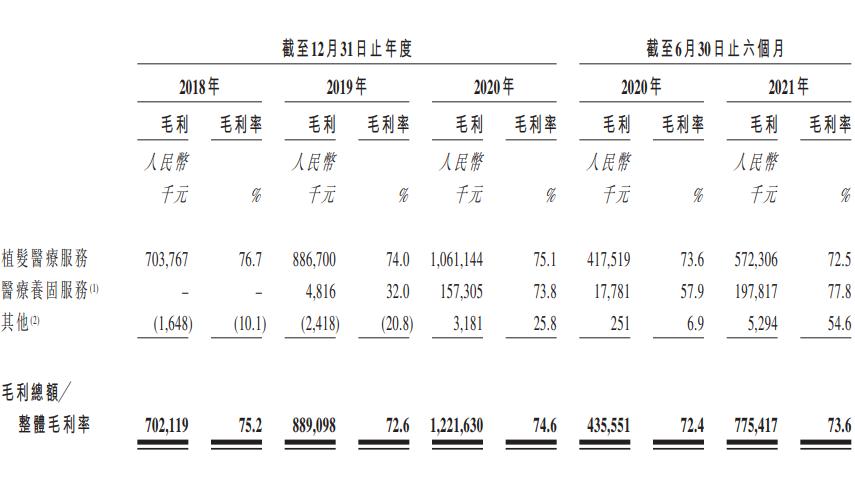 在医疗服务行业里,有句俗语是“金眼、银牙、铜骨头”,说的是各大专科的盈利能力。但和植发相比,即便是“金眼、银牙”也要逊色不少。2021年上半年,雍禾医疗的整体毛利率高达73.6%,而同期眼科龙头爱尔眼科(300015,SZ)的毛利率为48.74%,牙科龙头通策医疗(600763,SH)的毛利率为46.75%。对比之下,足以看出植发行业的“暴利”。