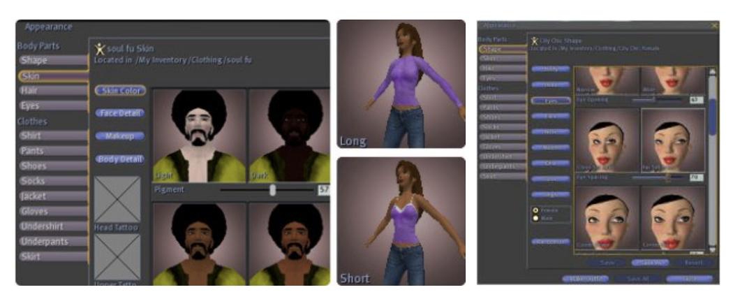 本质上你的选择必须是人形,但是你可以调整参数,可以将纹理应用于身体,比如修改服饰、皮肤等等。系统中还有一些“附着点”,你可以将它们视为头部、肩膀、胸部……的图解点,你可以在点上附着其它东西。如果愿意,你可以穿上米老鼠衣服,你也可以按自己的喜好设计虚拟替身,服装就是附着在点上的衣服。