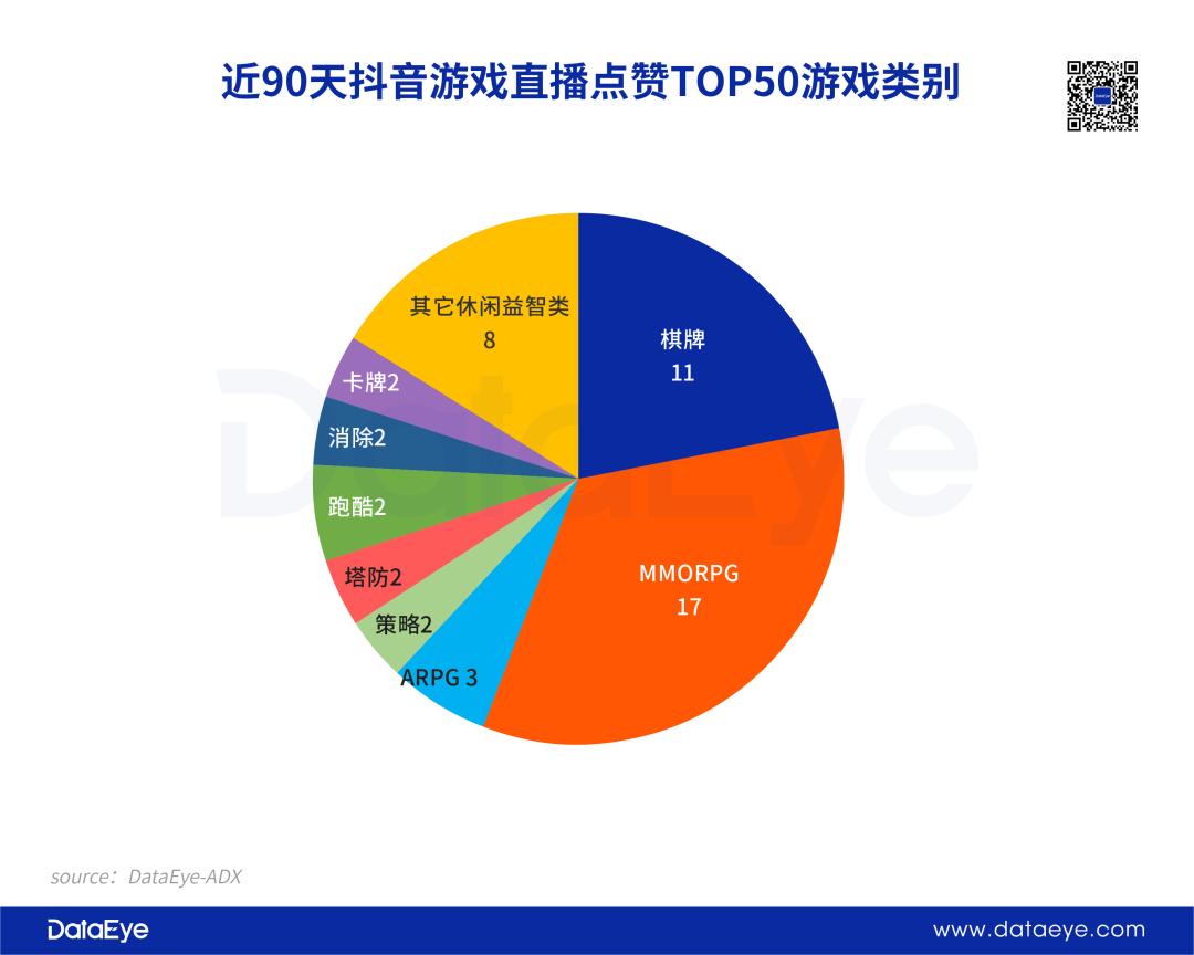 棋牌类11款,同时直播场数、总点赞数位居TOP50前列。MMORPG虽然位于中下位置,却是数量最多的品类,共计17款。此外,其它休闲益智(如贪食蛇)等也有8款。这三类共占TOP50游戏的72%。