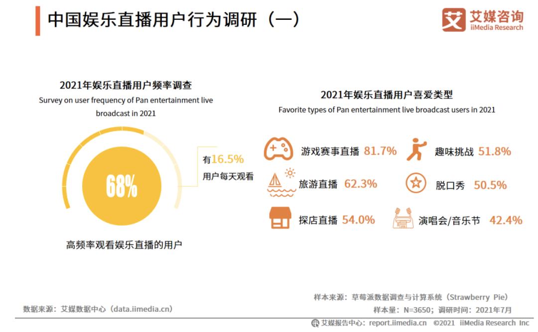 艾媒咨询数据显示,2021年上半年中国在线直播用户观看的主要直播类型是电商直播和娱乐直播,分别占比60.8%和57.1%。其中,娱乐直播主要就是游戏、游戏赛事直播(占比81.7%)。受疫情影响,线下的娱乐业态向线上延伸,为娱乐直播带来一波流量红利,增加了受众面和影响力。