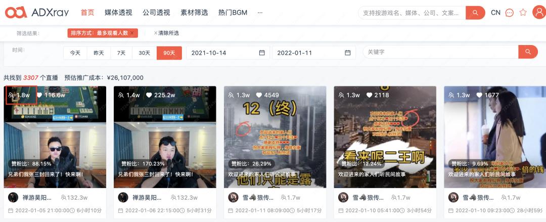 近90天,抖音达人直播最多点赞的游戏,观看人数最多的一场直播仅1.8万次观看,第二的为1.4万、第三为1.3万。
