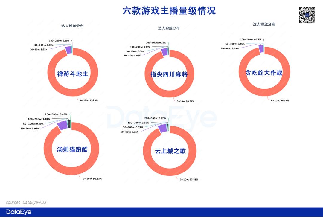 3、从达人粉丝量来看:0-10万粉的达人居多,这主要因为抖音游戏直播目前处于初级阶段,参与的达人大多仍处于粉丝累积阶段,超过50万粉的本就数量极少。此外,与斗鱼、虎牙、YY的头部主播(不少为电竞选手或游戏达人)相比,抖音游戏主播相对业余、分散、知名度也较低。