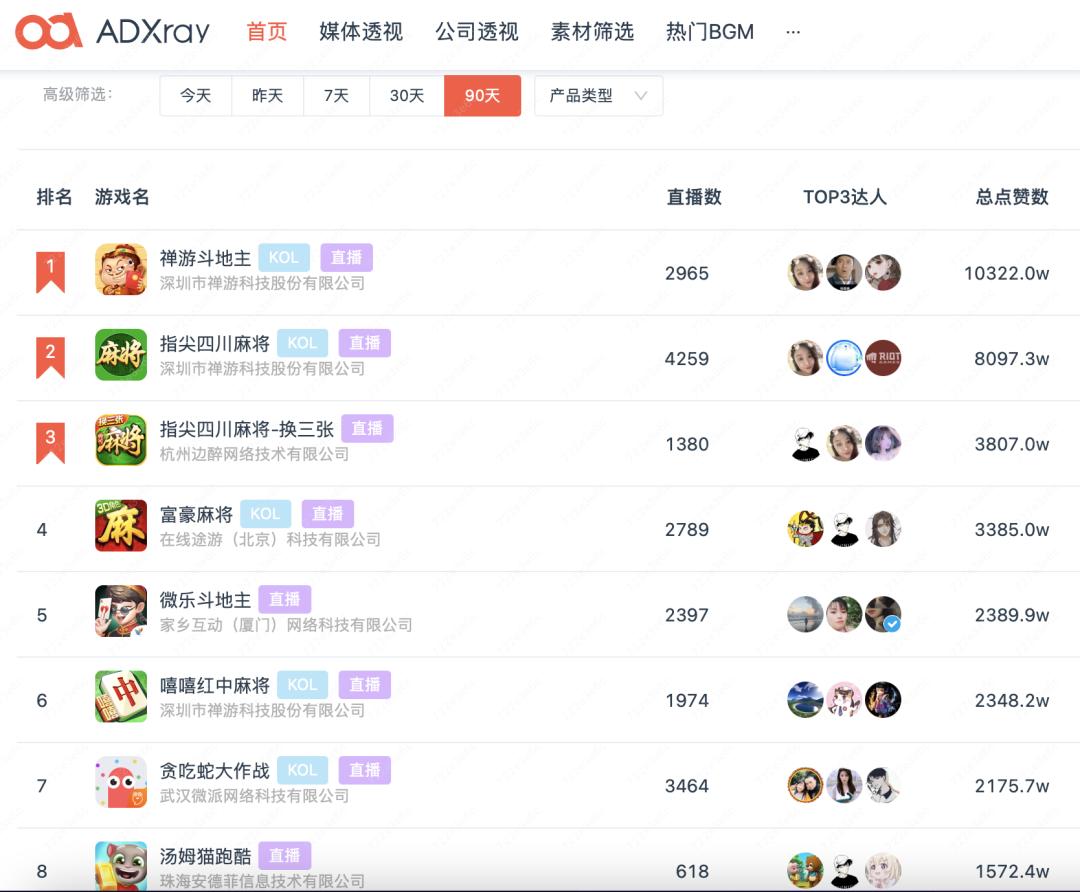 DataEye-ADX数据显示,近90天,一大批棋牌类、休闲类游戏已进行数千场抖音游戏直播。其中,总点赞数最高的《禅游斗地主》已进行了2965场直播,每日直播约33场,总点赞数高达1个亿(游戏直播点赞可以多次操作、累积叠加,因此奇高)。中重度游戏中,《斗罗大陆:武魂觉醒》、《云上城之歌》都以进行了过千场游戏直播,分别收获859万、702万点赞。