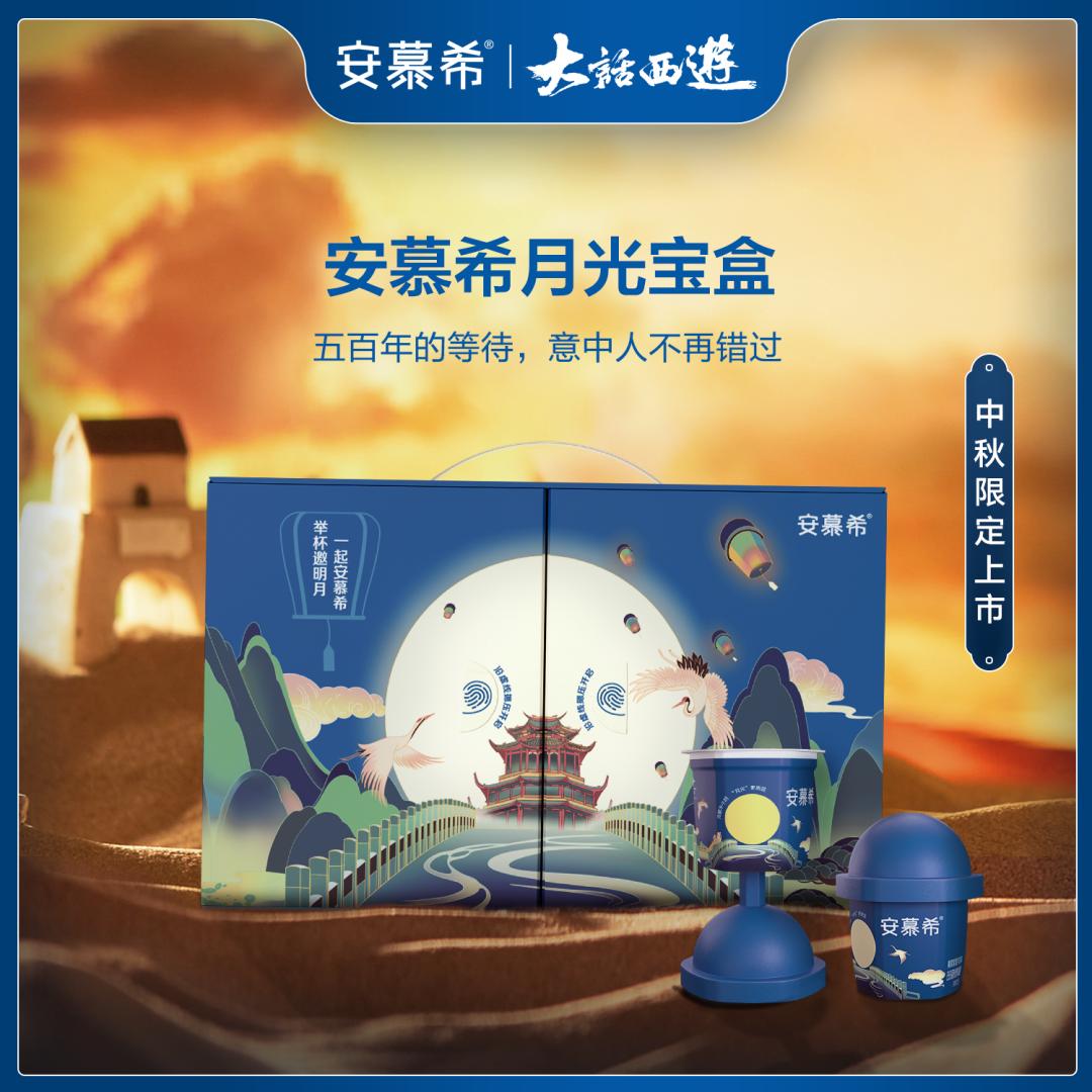 安慕希与大话西游联名推出中秋限定的“月光宝盒”,礼盒中酸奶的圆形杯盖打开后,可以安装在底部,变身中式“高脚杯”造型,和家人朋友们一起“举杯”,共赏中秋月。除了“月光杯”,这款酸奶它还有一个“隐藏技能”,就是冷藏半小时后,杯子上的明月会显现出淡黄色的月光,既有了中秋的意趣,也让普通的酸奶产品变得趣味十足。