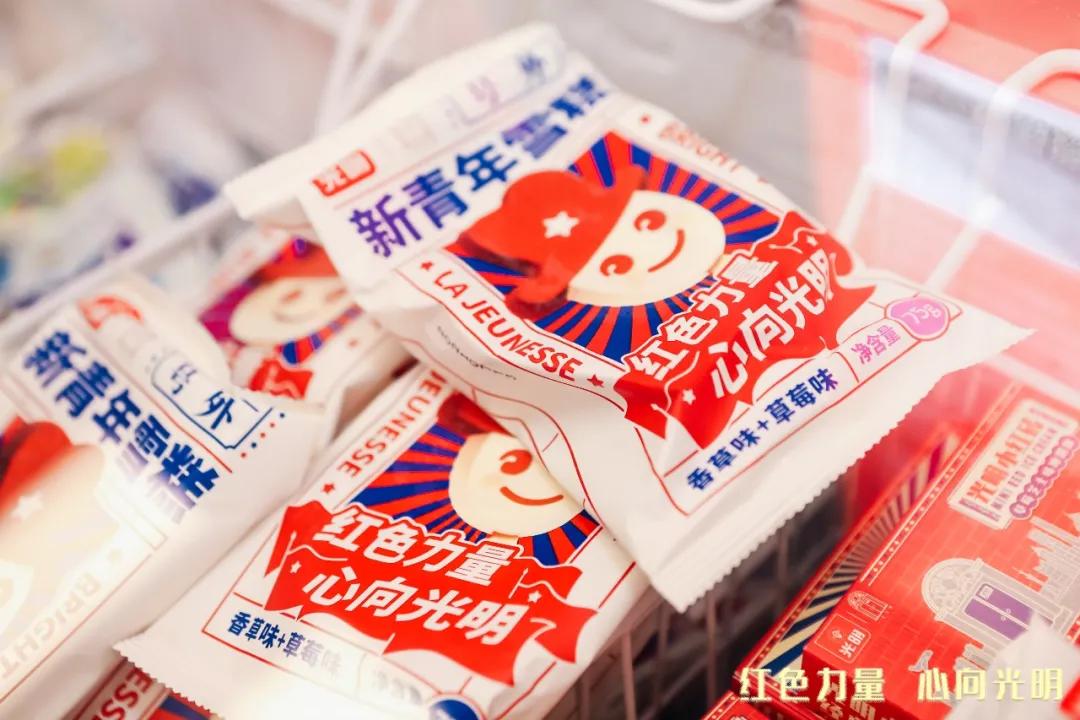 光明乳业与一大文创推出的这款“新青年雪糕”,就瞬间带大家穿越回了遥远又澎湃的红色年代。产品包装参考了“新青年”期刊、民国时期的报纸风格,娃娃头戴具有标识性的红色礼帽,再配上底部的红旗和口号,红色力量拉满!