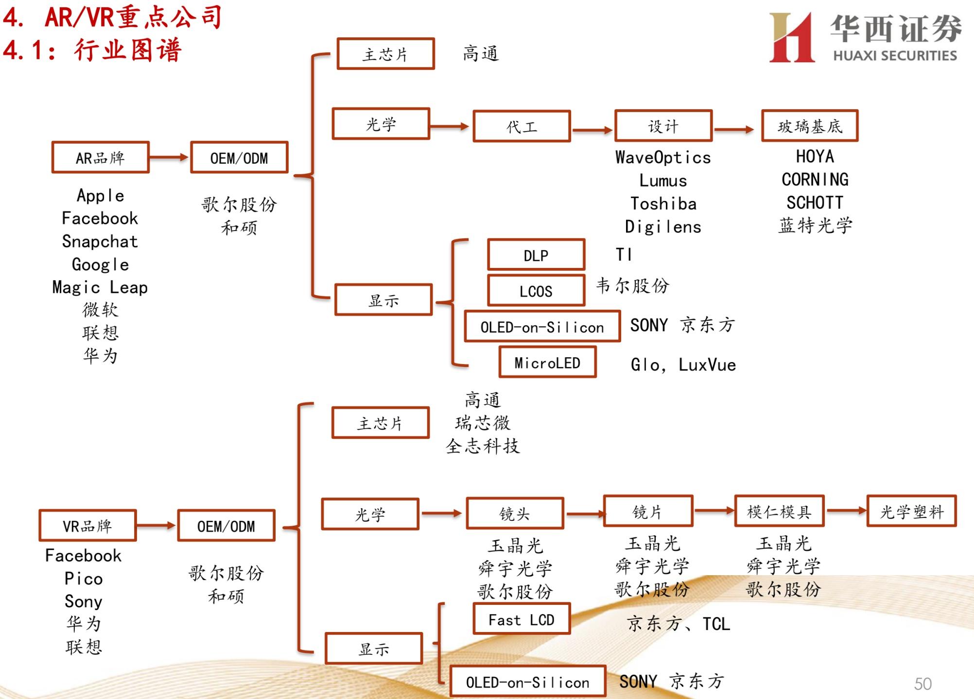 iPhone的“黄金十年”,铸就一大批“果链”企业增长神话,包括富士康、和硕科技、广达电脑等等。而VR/AR 行业的产业链环节和智能手机大体相似,包括硬件、软件、内容制作与分发以及应用与服务四个环节,主要区别在于智能手机应用面向个人消费者,VR/AR 除个人消费者外,还渗透到各行各业的应用中,因此在应用环节相对复杂很多。