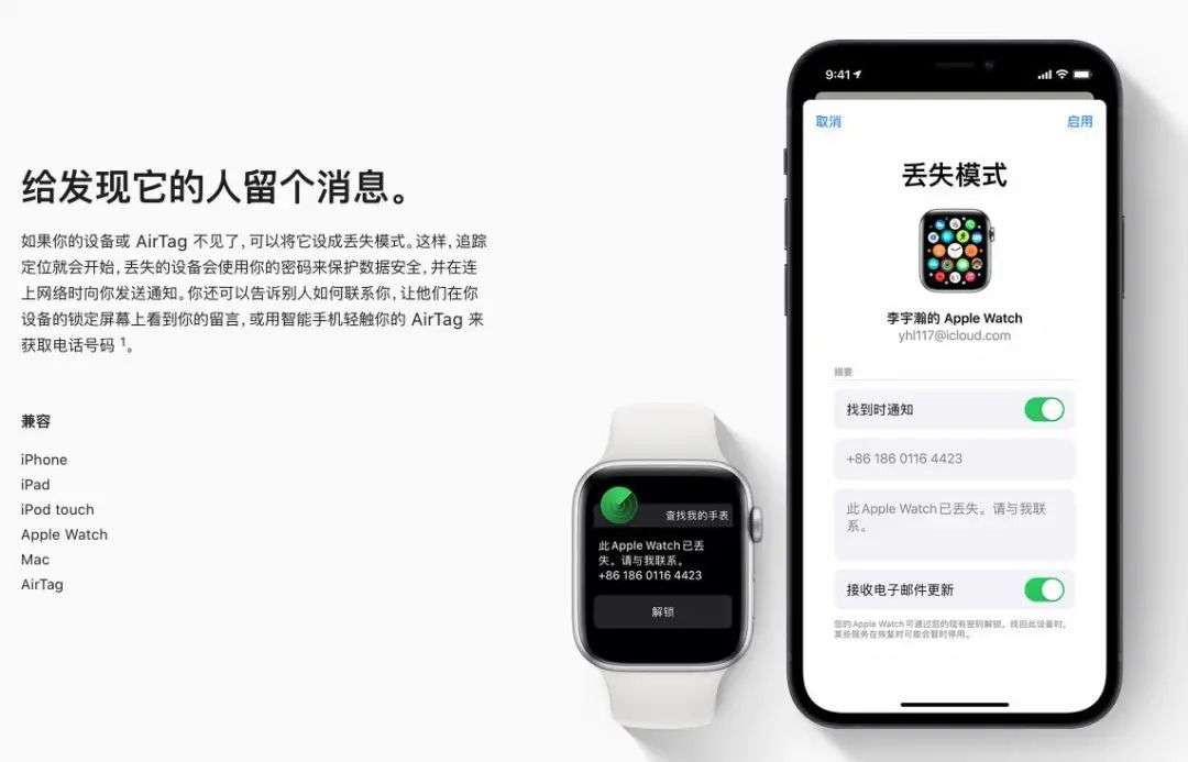 已经丢失的 iPhone、Apple Watch 等苹果自研设备,将其设置为丢失模式,并添加联系方式,一旦有其他 iPhone 用户识别到丢失手机,就可以通过联系信息和失主联系了。