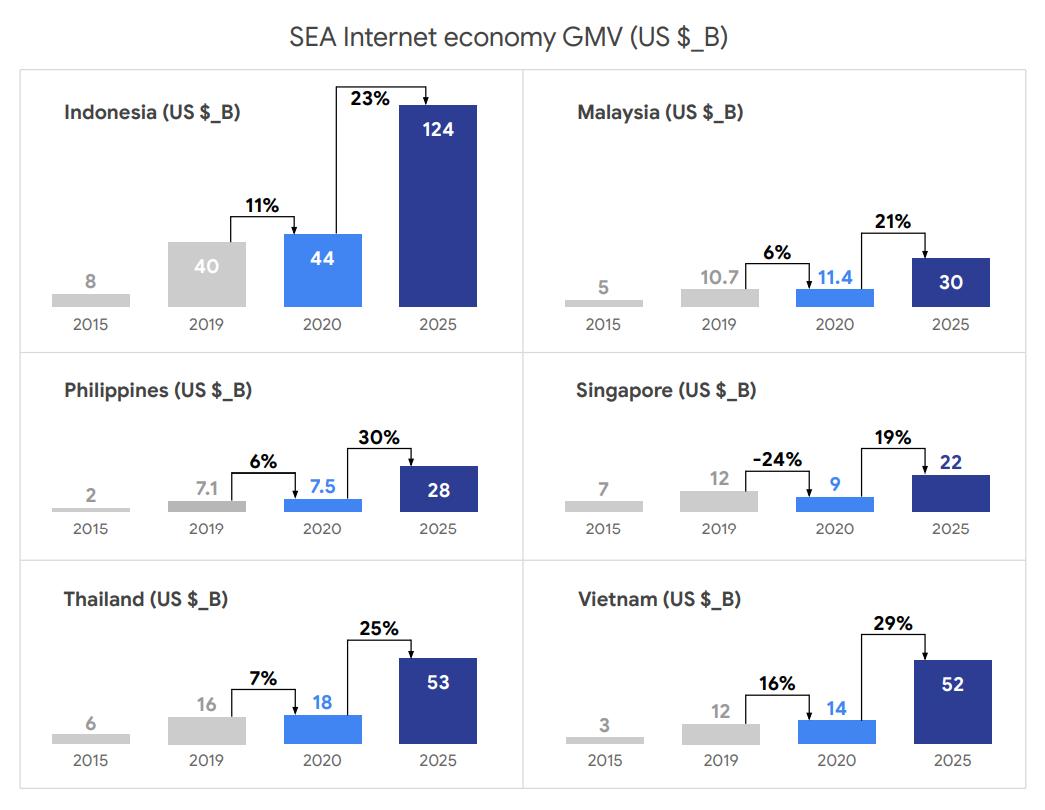 谷歌、淡马锡和贝恩联合发布的2020东南亚数字经济报告显示,去年全球六大经济体(中国、美国、日本、德国、印度及法国)因疫情新增互联网用户达4000万,按年增长3倍,令其用户占比升至人口70%。其中,东南亚市场被认为是具有很大潜力的市场之一。也就是说,疫情让全球经济降速,但却成为东南亚电商市场的“加速器”。联合报告显示,2020年东南亚互联网经济GMV超1000亿美元,并且随着数字化的普及和应用升级,预计到2025年将有望突破3000亿美元。