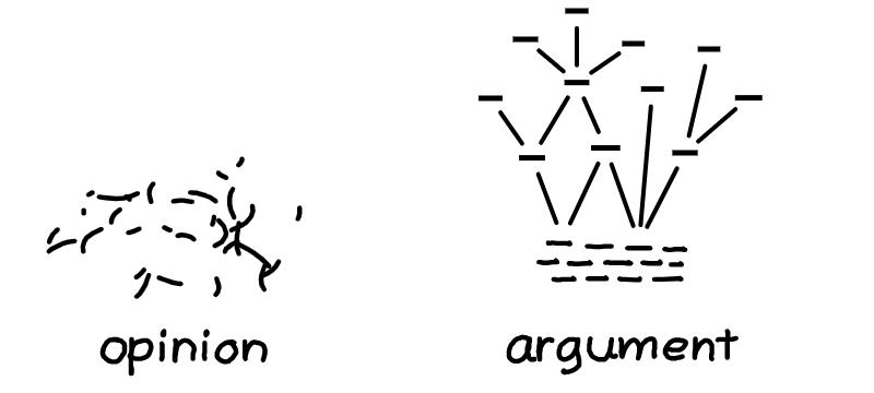 观点的问题在于,它无法被验证。观点通常是基于未经质疑的信念。而论证可以被验证,原因有二,论据是基于知识和逻辑。
