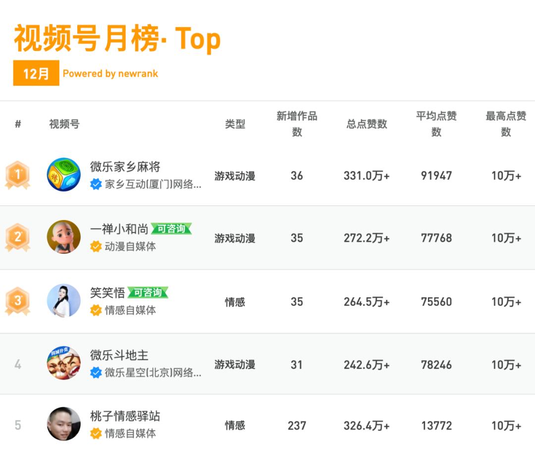 不仅如此,上线已经两年的视频号仍然面目模糊,既没有诞生风靡全网的现象级创作者,头部视频号也仍被情感、时事、生活等大众机构号所占据,至今未形成自己的鲜明特色。