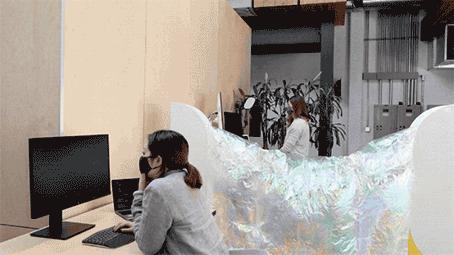 4 月 7 日,由机器人充气展开的「气球墙」也在 Googleplex 内启用,不仅可以起到遮挡的作用,还能减少噪音污染。