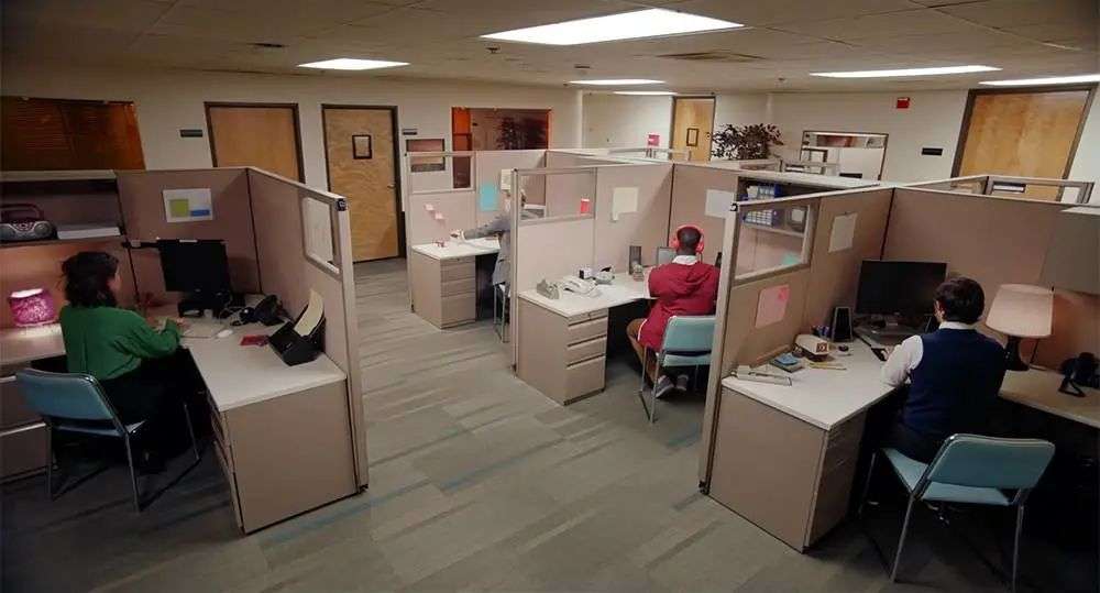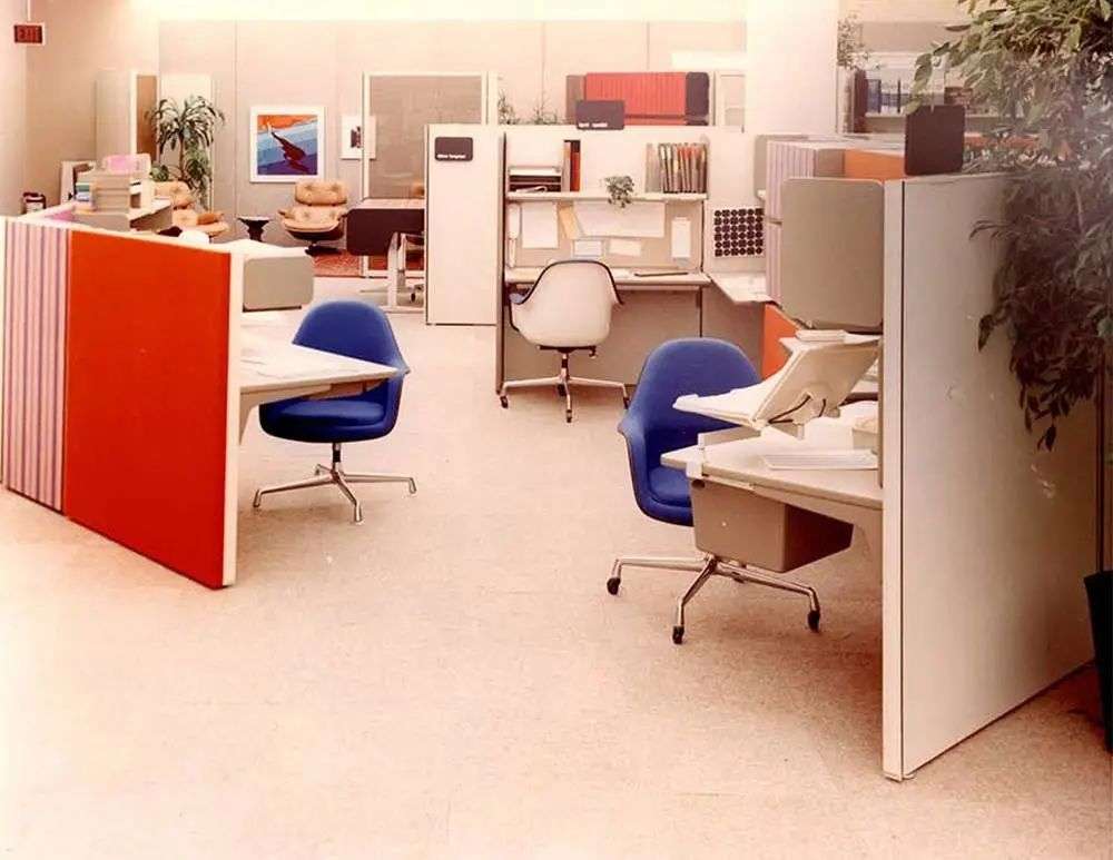 隔间的那些隔断板被视为办公室的一面面「墙」,这些「墙」在 90 年代被越来越多的公司推倒,开放式也随之回到了办公室的主流位置上。