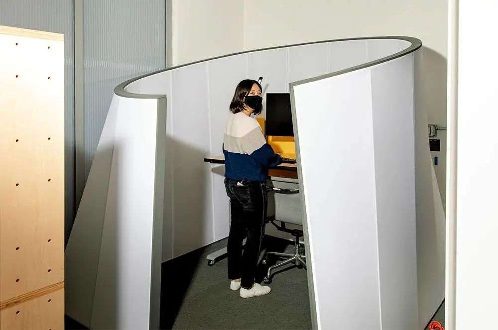 这款工作舱外壳覆盖着灰色毛毡,两侧还可以伸出挡板,避免更多的窥视与干扰。工作舱内部用背光 LED 灯来照明,变化的灯光颜色可以提供更好的工作氛围。