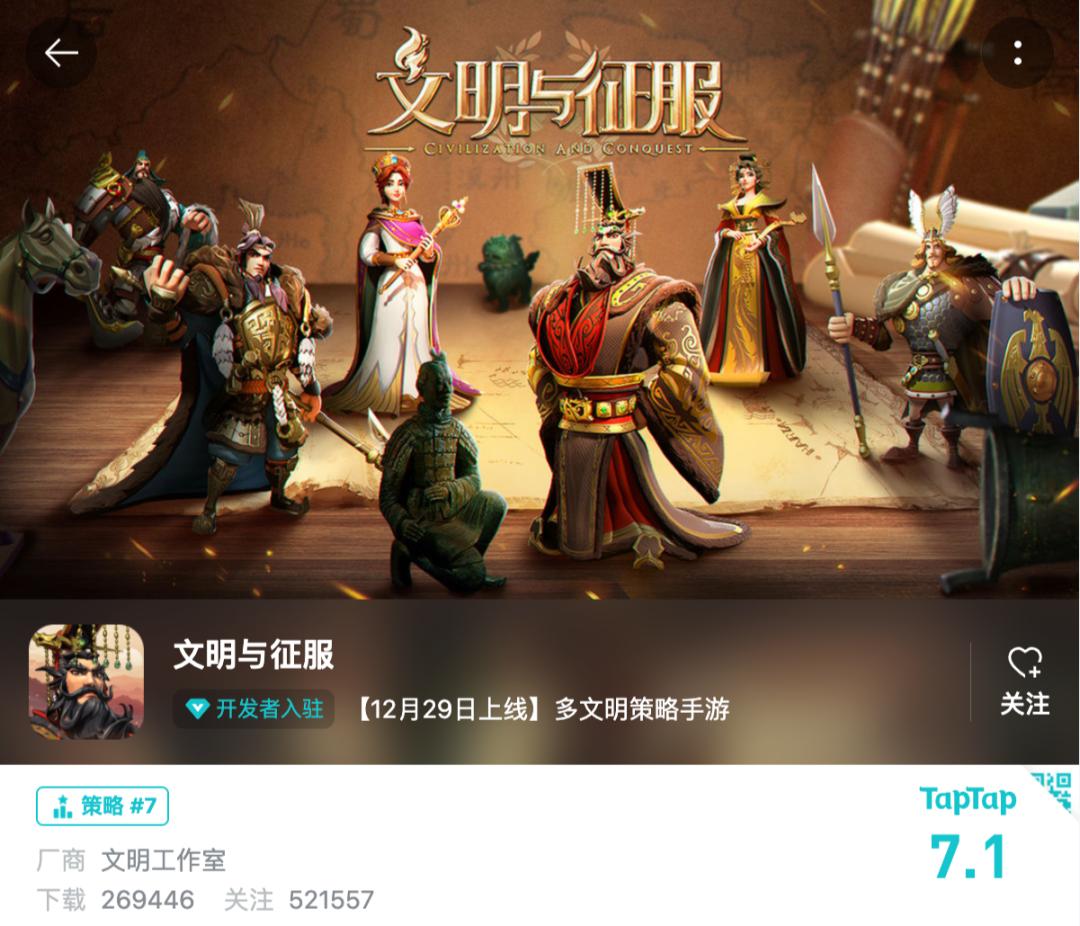 作为对手,《文明与征服》目前评分TAPTAP评分7.1,iOS策略游戏排行第4。