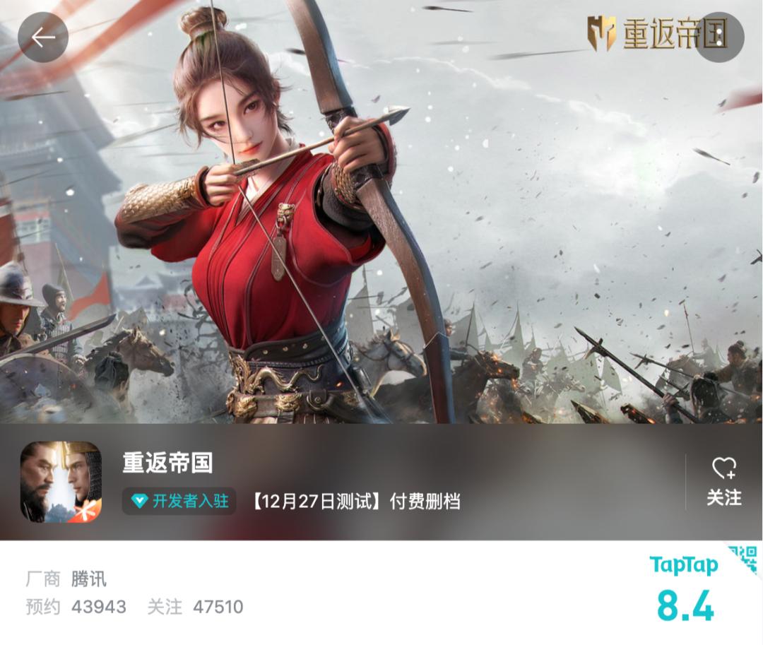 2021年12月27日,天美工作室群与微软Xbox Game Studios战略合作的全自由即时策略手游《重返帝国》正式启动征服测试,TAPTAP评分8.4,是腾讯系为数不多超过8分的优质作品。