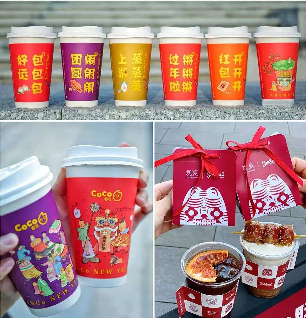 最近Seesaw联名观夏,推出新年特调,老虎杯套与酒红色调结合,年味中又透露着丝丝质感。CoCo、古茗等茶饮品牌也在杯套上,紧扣春节传统文化挥洒创意,用营造年味。