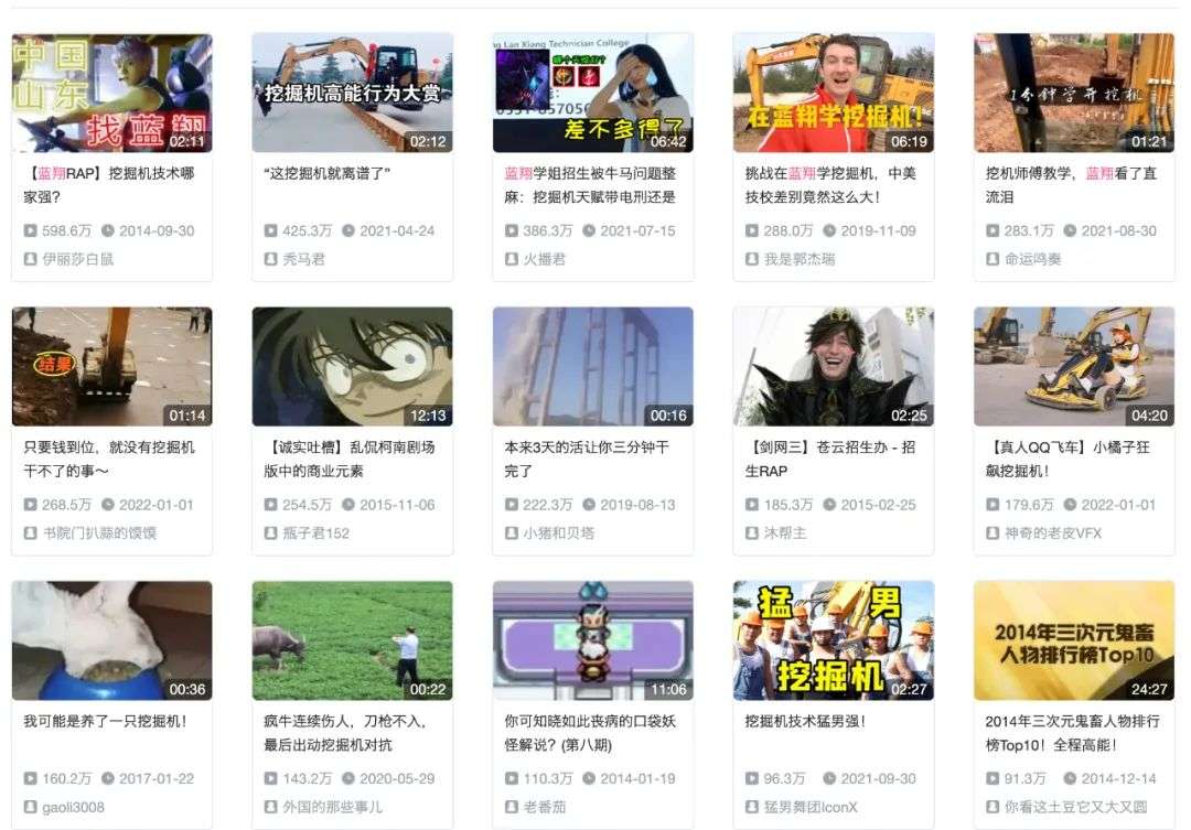 从内容二次创作传播角度看,90 后、00 后本身对诙谐有趣的互联网文化有着较强的接受能力,比如在 B 站搜索「蓝翔」,你就会发现,「蓝翔」已经不是一个职业技术学校的名称,「挖掘机」是鬼畜区重要的创意素材。