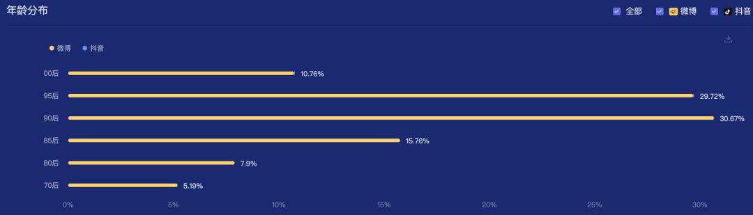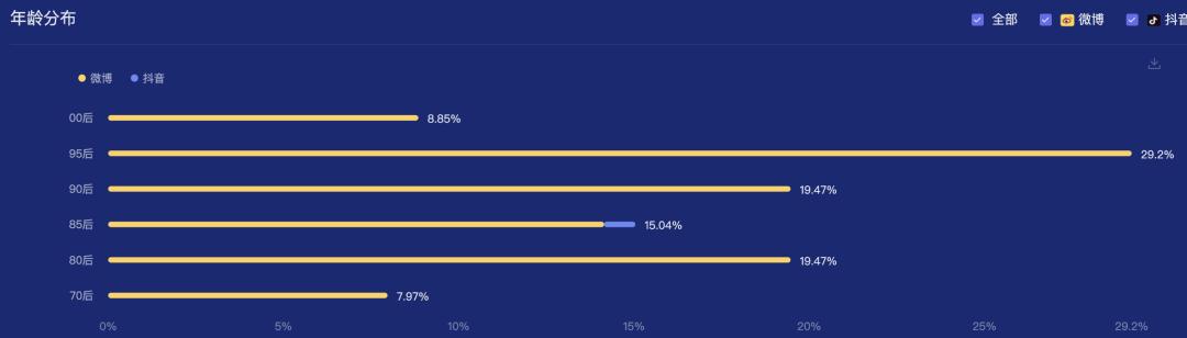 从社交平台的品牌人群画像上来看,「QQ飞车手游」和「蓝翔职业技术学校」粉丝的年龄分布都主要集中在95后,有很大的用户年龄层重合度;除了95后,「QQ飞车手游」更集中在90后粉丝,而「蓝翔职业技术学校」则集中在80后。受众年龄层的年轻化,是这次两者合作,在社交平台上破圈的助推力。