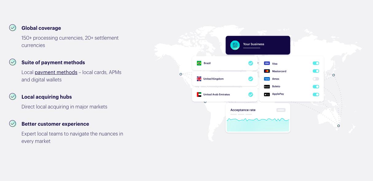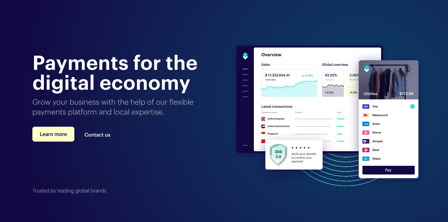 Checkout.com成立于2012年,是一个帮助企业处理在线支付的全栈式支付平台:它可以作为网关、收单机构、风险引擎和支付处理器。用户既可以直接在网站或应用程序中进行支付,也可以依靠托管的支付页面,创建支付链接等等。它支持银行卡支付、Apple Pay、Google Pay、PayPal、支付宝、银行转账、SEPA直接扣款,以及通过本地网络进行现金支付。