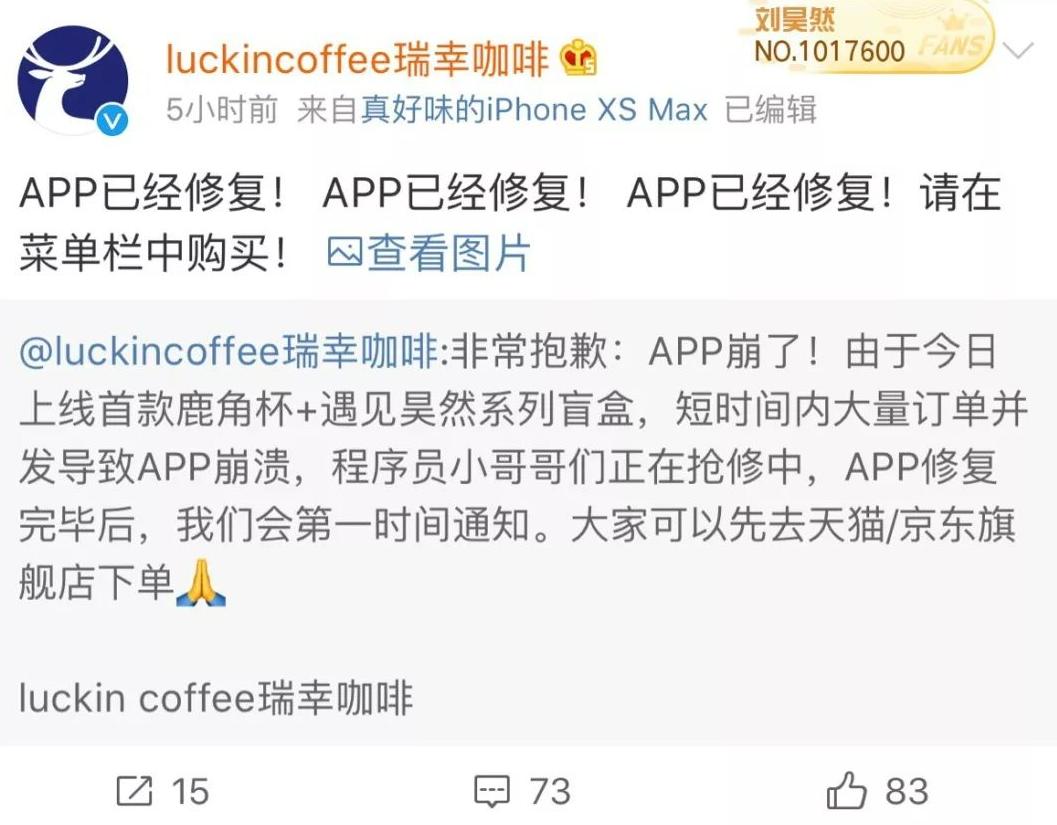 当年瑞幸咖啡推出代言人刘昊然形象的盲盒,商品刚刚上线,大量粉丝和盲盒玩家集体涌入,瑞幸APP就连崩三次。其天猫、京东等平台的旗舰店也创下日销记录,官方临时紧急补货同样秒空。
