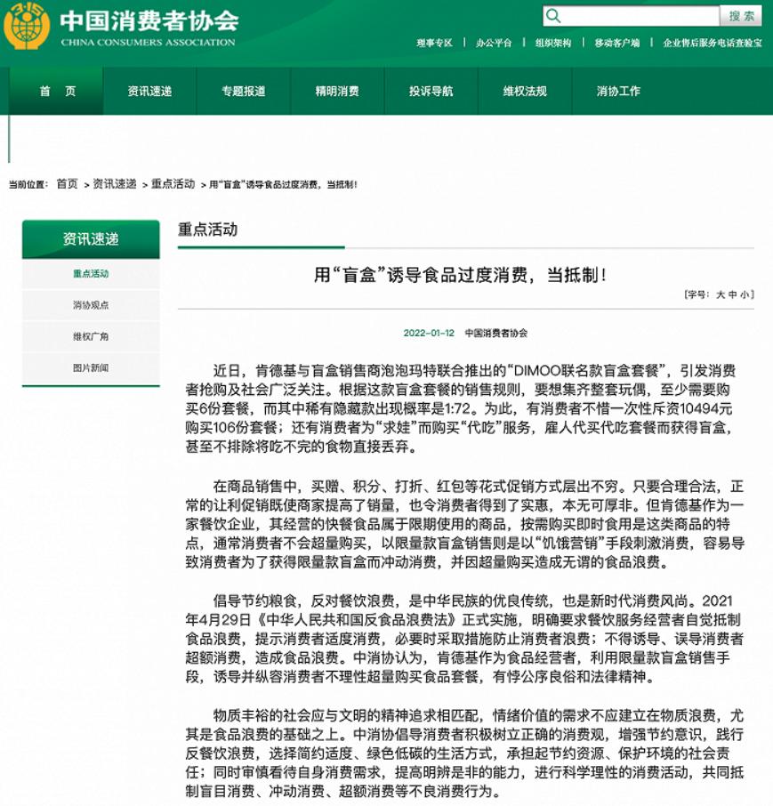 1月12日,中消协点名肯德基,按需购买即时食用的快餐,通常消费者不会超量购买,以限量款盲盒销售则是以“饥饿营销”手段刺激消费,容易导致消费者冲动消费,并造成食品浪费,此行为应当全社会共同抵制。