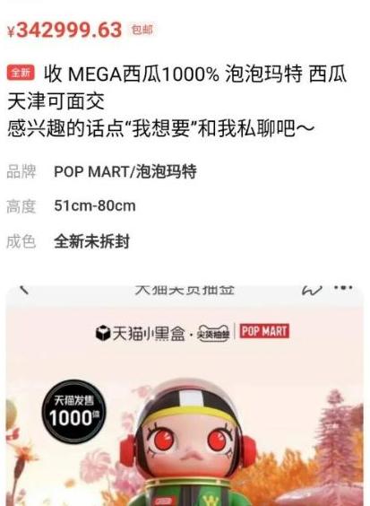 举一个比较极端的案例,去年泡泡玛特推出限量版的MEGA珍藏系列,包括70厘米和29.5厘米的两款娃娃玩具,发售价分别为3999元、1099元,上线后均1秒售罄。随后在二手平台上,有人喊出了35万元的收购价。