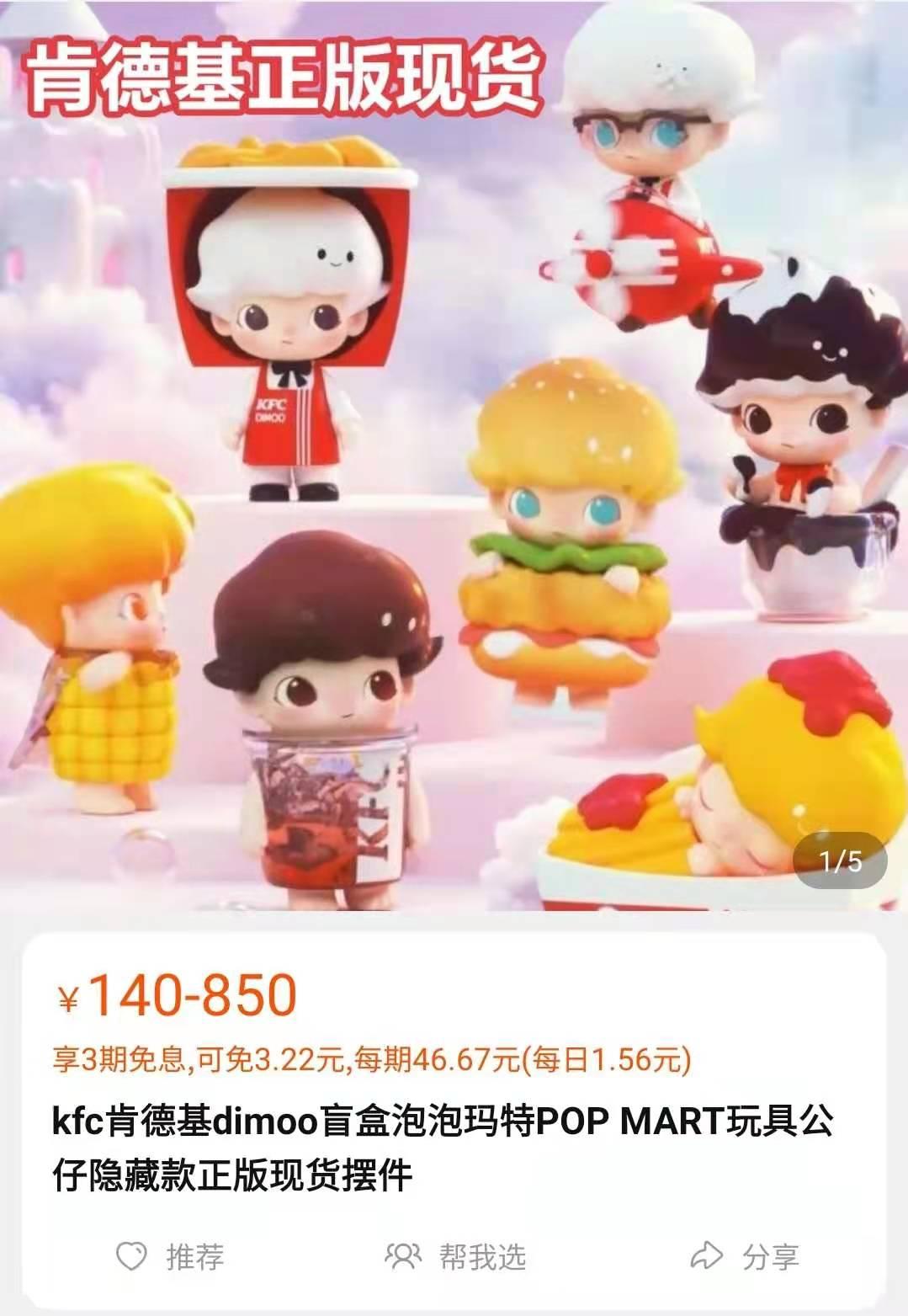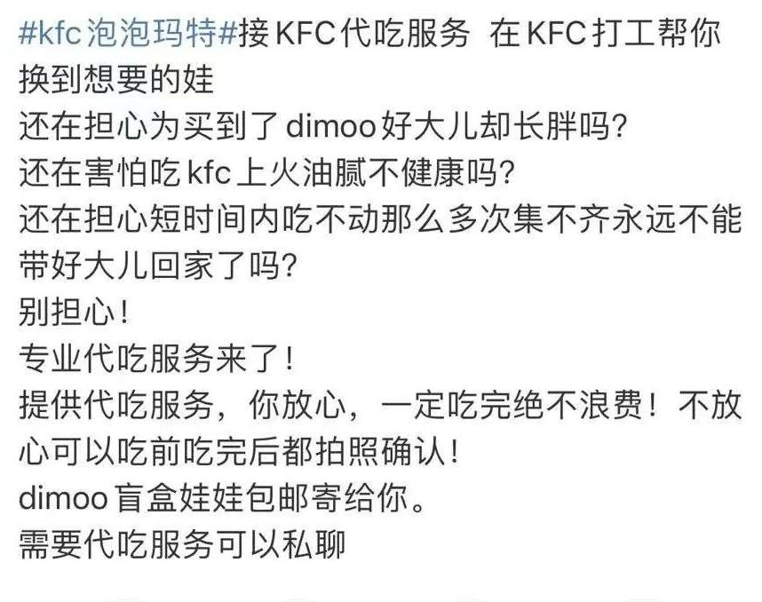 有人甚至为此斥资万元,批量采购了百份套餐。还有人远程指导外卖小哥,“盲盒归我,炸鸡归你”。总之,机智的盲盒玩家有一百种方法,去解决想要DIMOO好大儿和不想吃肯德基之间的矛盾。