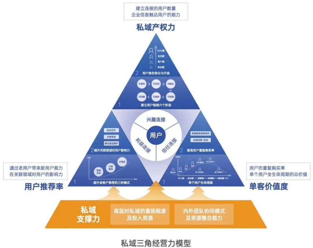 无独有偶,在国内,有赞提出了“私域三角”模型。包含体现广度的私域产权力——建立连接的用户数量和企业信息触达用户的能力、体现粘性的单客价值度——用户的重复购买率和单个用户全生命周期的总价值、体现深度的用户推荐率三个维度。