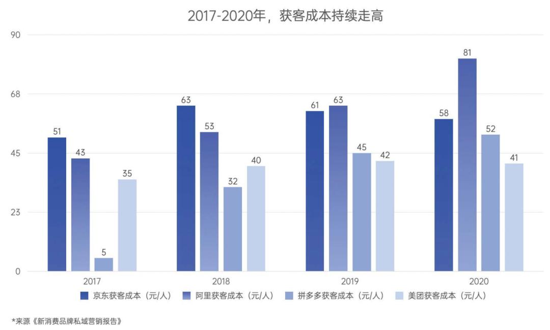 《哈佛商业评论》中文版联合有赞新零售发布的报告透露,从2017年到2020年,京东、阿里、拼多多、美团的获客成本,分别从51元、43元、5元、35元,大幅抬升至58元、81元、52元、41元,尤以拼多多最甚,5年间大幅上涨了8倍。