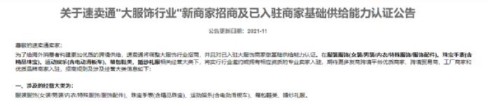2021年11月,速卖通对更新了关于“大服饰行业”新卖家招商公告,对新卖家提高了要求。