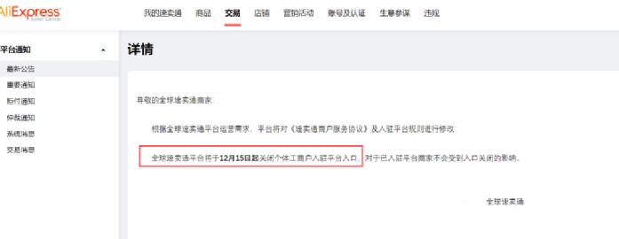 那就是从12月15日起,速卖通将关闭个体工商户入驻平台的入口。
