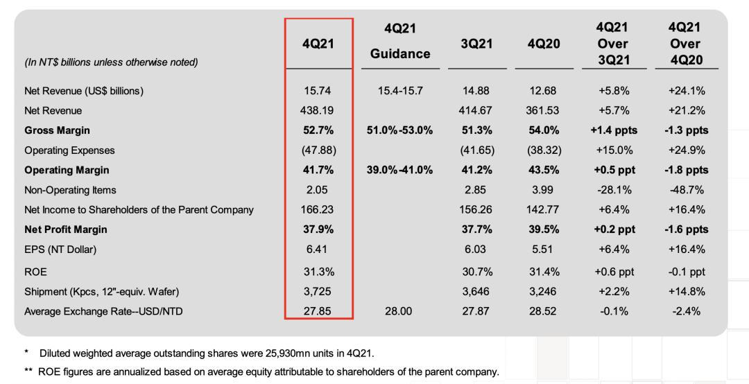 台积电也发布了新的业绩指引:2022年一季度预期收入166-172亿美元(市场预期158亿美元)和毛利率53-55%(市场预期51.8%)。