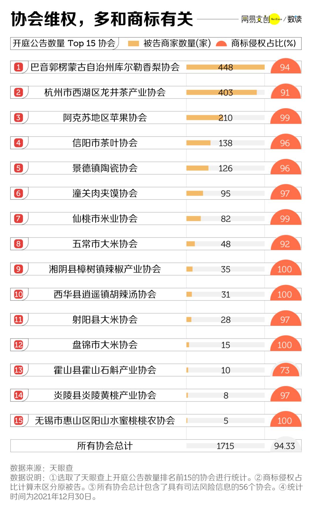 不过,它们并不是维权事业最繁忙的协会。根据我们对天眼查相关开庭公告信息的统计,库尔勒香梨协会和西湖区龙井茶产业协会已经起诉了 400 多家的商户。