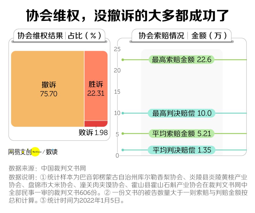 我们统计了库尔勒香梨协会、潼关肉夹馍协会等协会相关诉讼的裁判文书 606 份,最高索赔记录是 22.6 万,不过实际判赔最高只到 5.21 万。