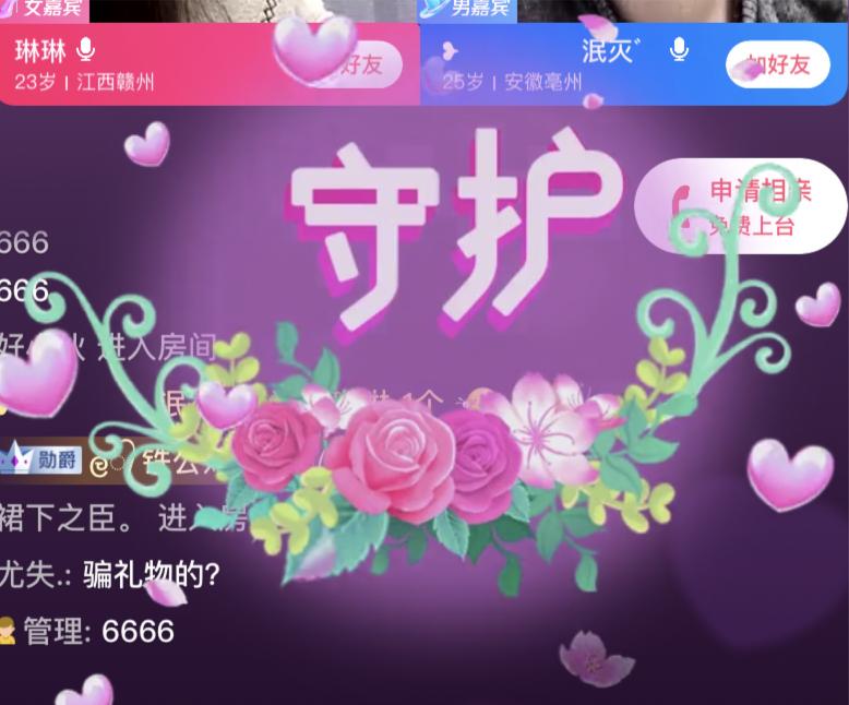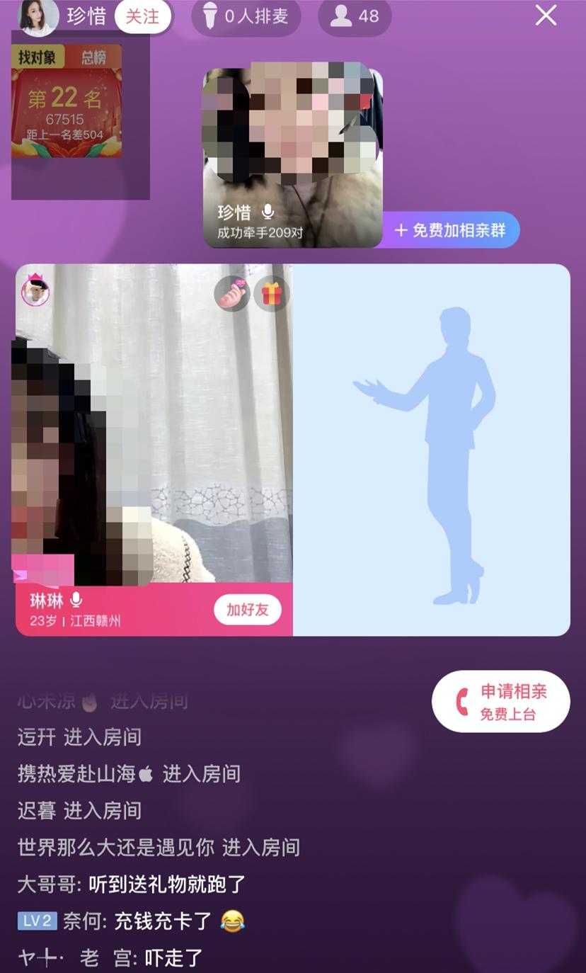 这个直播间归属于红娘,其中有个固定女嘉宾琳琳,一个上麦的男嘉宾,还有48个围观群众。
