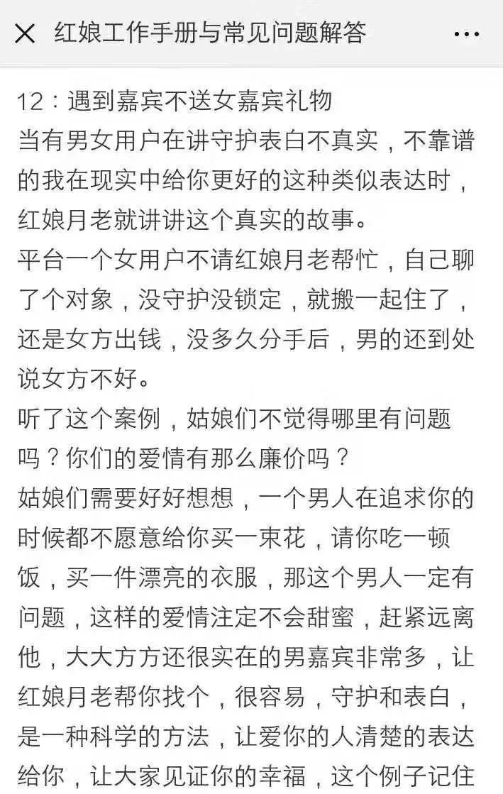 网上流传着一份《红娘工作手册》,里面就有专门针对“遇到男嘉宾不送礼物”的话术培训。